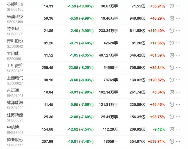 國(guó)慶假期后的第一個(gè)交易日,光伏板塊高開(kāi)后一路下跌,截至收盤(pán),光伏產(chǎn)業(yè)指數(shù)(東財(cái))下跌2.8%,50支成分股僅有14家上漲,而跌幅超過(guò)5%的個(gè)股達(dá)到15家。其中,芯能科技和晶澳科技跌停,特變電工、太陽(yáng)能盤(pán)中一度封死跌停。