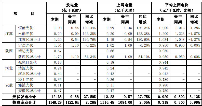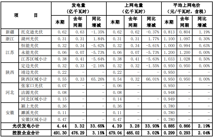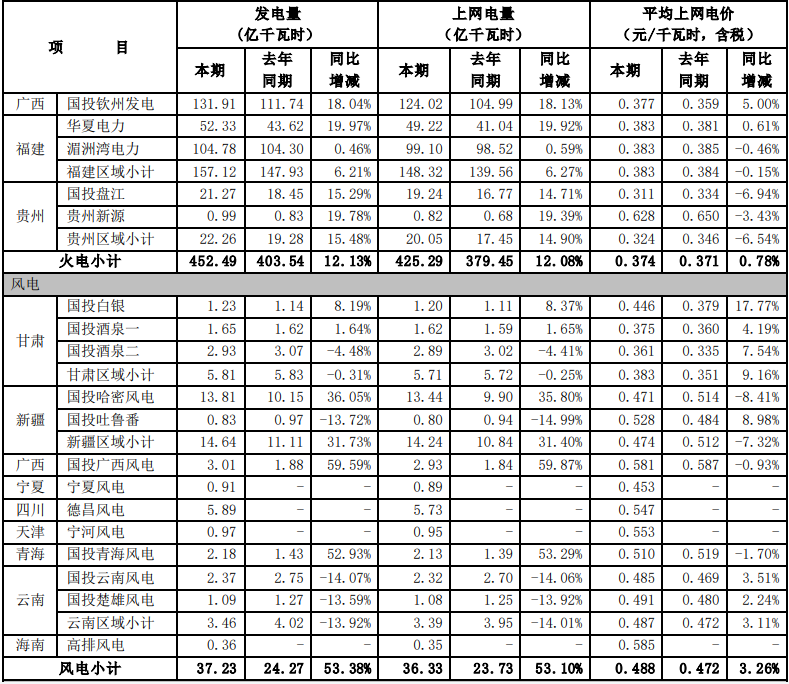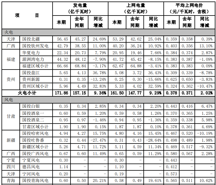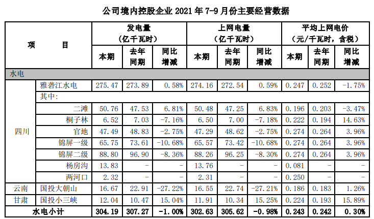 根據(jù)國投電力控股股份有限公司(以下簡稱公司)境內(nèi)控股企業(yè)初步統(tǒng)計, 2021年 7-9 月,公司境內(nèi)控股企業(yè)累計完成發(fā)電量491.30 億千瓦時,上網(wǎng)電量479.04 億千瓦時,與去年同期相比分別增加3.15%和3.02%。2021年1-9月,公司境內(nèi)控股企業(yè)累計完成發(fā)電量1148.29億千瓦時,上網(wǎng)電量1116.45億千瓦時, 與去年同期相比分別增加 2.28%和2.05%。 2021年7-9 月,公司境內(nèi)控股企業(yè)平均上網(wǎng)電價0.299 元/千瓦時,與去年同期相比增加了 2.04%。