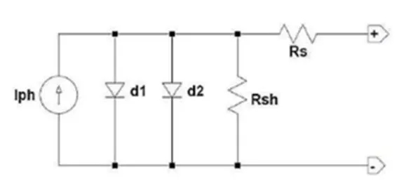 為研究210低輻照性能優(yōu)勢,本文以雙二極管模型對測試樣件進行建模分析;二極管模型表征電池及組件特性被廣泛使用,例如PVsyst中的PAN file; 在傳統(tǒng)的單二極管模型上,雙二極管模型額外考慮了耗盡區(qū)的復合損耗,可以有效驗證低輻照下組件性能: