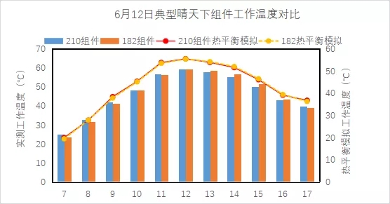任選典型晴天下,組件工作溫度實測與模擬結(jié)果均顯示,210組件并無高工作溫度風險,且早晚低輻照時段,210組件溫度略有優(yōu)勢: