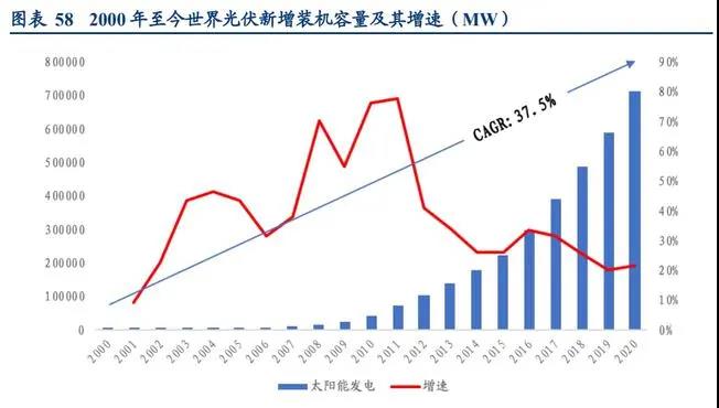 2014 年之后,光伏發(fā)電行業(yè)經(jīng)過優(yōu)勝劣汰的篩選,發(fā)電成本持續(xù)大幅下降,投資回報(bào)重 新獲得平衡,全球更多的國家加入到支持光伏發(fā)電的行列,具有技術(shù)研發(fā)優(yōu)勢、規(guī)模優(yōu)勢的企業(yè)涌現(xiàn)。縱觀歷史,近20年間光伏增速年均復(fù)合增長率達(dá) 37.5%。