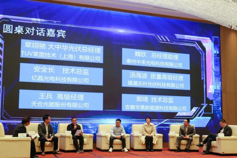“圓桌對話”環(huán)節(jié)邀請的嘉賓分別是:TUV萊茵技術(上海)有限公司光伏組件總經(jīng)理章翊馳、億晶光電科技有限公司技術總監(jiān)安全長、天合光能股份有限公司實驗室高級經(jīng)理王兵、泰州中來光電科技有限公司總經(jīng)理助理魏欽、隆基樂葉光伏科技有限公司高級經(jīng)理湯海波、安徽華晟新能源科技有限公司技術研發(fā)中心產(chǎn)品開發(fā)總監(jiān)郭琦。各位嘉賓暢所欲言,表達了自己對光伏行業(yè)發(fā)展的看法,并將此次質(zhì)量提升會議的情緒推向了高潮。
