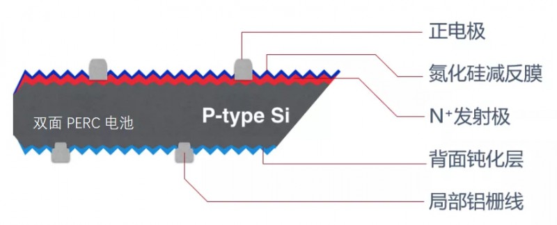 目前主流的雙面組件都采用了雙面PERC電池,相比單面PERC電池,其背面采用局部鋁柵線代替全覆蓋的背鋁,使電池具有背面發(fā)電的能力,正、背面均可以收集電流,從而可實(shí)現(xiàn)雙面發(fā)電。