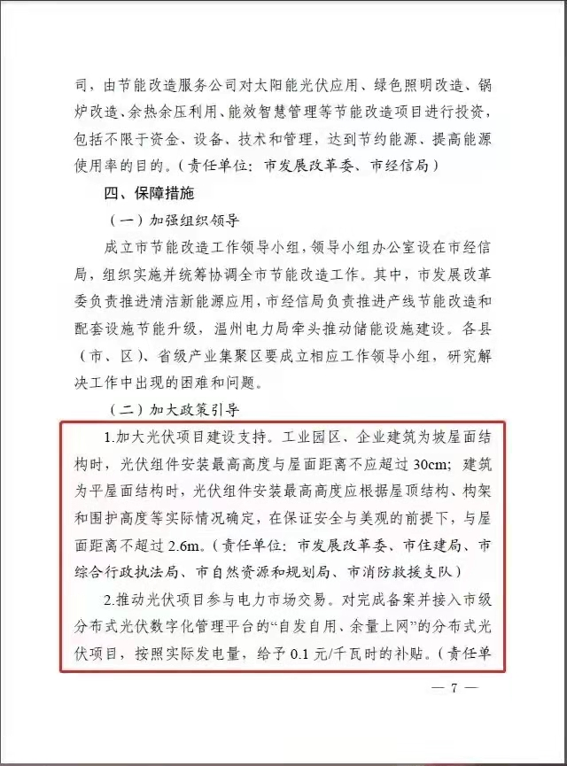 近日浙江溫州市和平湖市相繼公示了分布式補貼標準。10月25日,溫州市人民政府辦公室關(guān)于印發(fā)溫州市制造業(yè)千企節(jié)能改造行動方案(2021-2023)的通知。其中要求加大光伏項目建設(shè)支持。工業(yè)園區(qū)、企業(yè)建筑為坡屋面結(jié)構(gòu)時,光伏組件安裝最高高度與屋面距離不應(yīng)超過30cm;建筑為平屋面結(jié)構(gòu)時,光伏組件安裝最高高度應(yīng)根據(jù)屋頂結(jié)構(gòu)、構(gòu)架和圍護高度等實際情況確定,在保證安全與美觀的前提下,與屋面距離不超過2.6m。