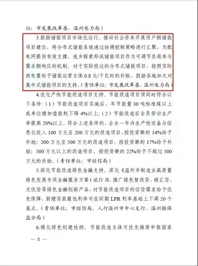 同時,推動社會資本開展用戶側(cè)儲能項目建設(shè),將分布式儲能系統(tǒng)通過協(xié)調(diào)控制策略進行匯聚,為配電網(wǎng)提供有效支撐,逐步探索形成儲能項目作為可調(diào)節(jié)負荷參與需求側(cè)響應(yīng)的機制。對于實際投運的分布式儲能項目,按照實際放電量給予儲能運營主體0.8元/千瓦時的補貼,鼓勵各地加大對集中式儲能項目的支持。