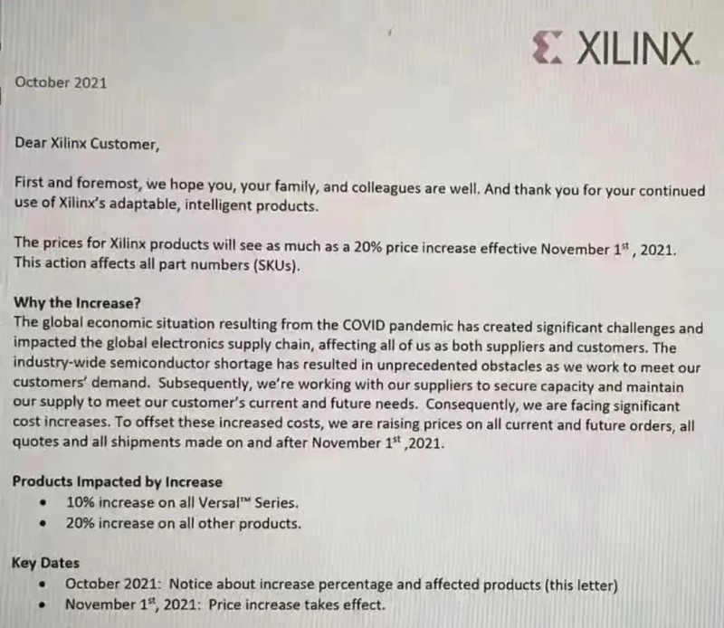 9月底,多家主要海外芯片生產(chǎn)商紛紛宣布,對IGBT和IC半導體等核心芯片展開新一輪漲價。意法半導體表示,將在今年最后一個季度提高所有產(chǎn)品價格,包括現(xiàn)有庫存;安森美則是從10月初開始,對部分產(chǎn)品漲價生效,新價格將適用于新訂單和現(xiàn)有積壓訂單;此外,賽靈思也發(fā)布通知稱,將會提高2021年11月1日及之后所有當前和未來的訂單、所有報價和所有發(fā)貨的價格。