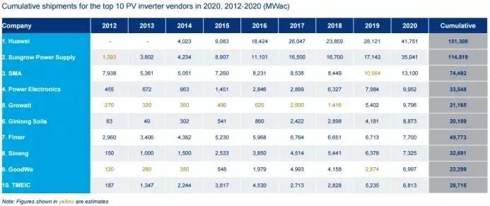 (2012-2020年全球前十逆變器供應商的出貨數(shù)據(jù)統(tǒng)計。來源:伍德麥肯茲)