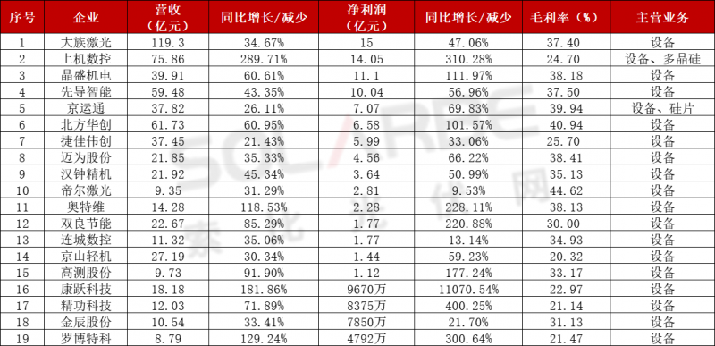 19家設(shè)備企業(yè)中,大族激光凈利潤最高,前三季度實(shí)現(xiàn)營收119.3億元,同比增長34.67%,實(shí)現(xiàn)凈利潤15億元,同比增長47.06%。光伏方面,公司Q1-3光伏行業(yè)專用設(shè)備實(shí)現(xiàn)營業(yè)收入8724.03萬,同比增長42.80%,劃裂機(jī)、開膜摻雜機(jī)等設(shè)備形成批量銷售。
