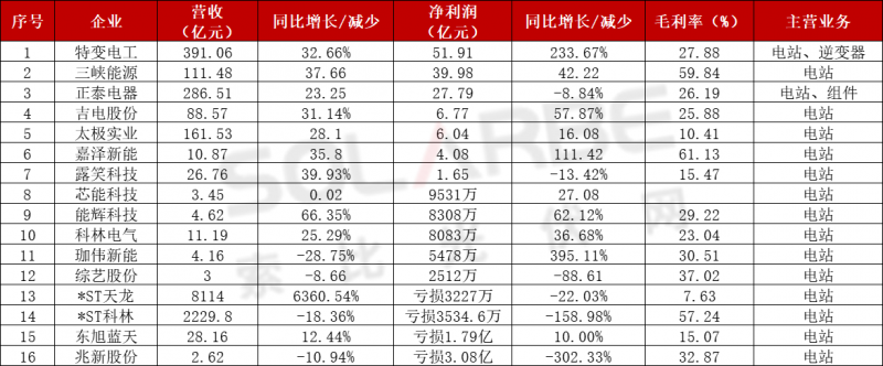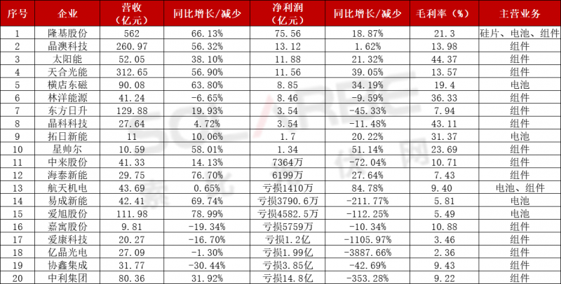 光伏企業(yè)前三季度凈利潤同增排行榜