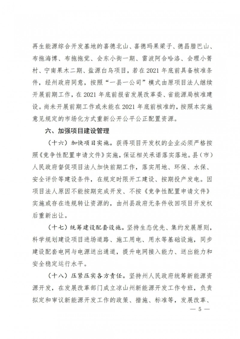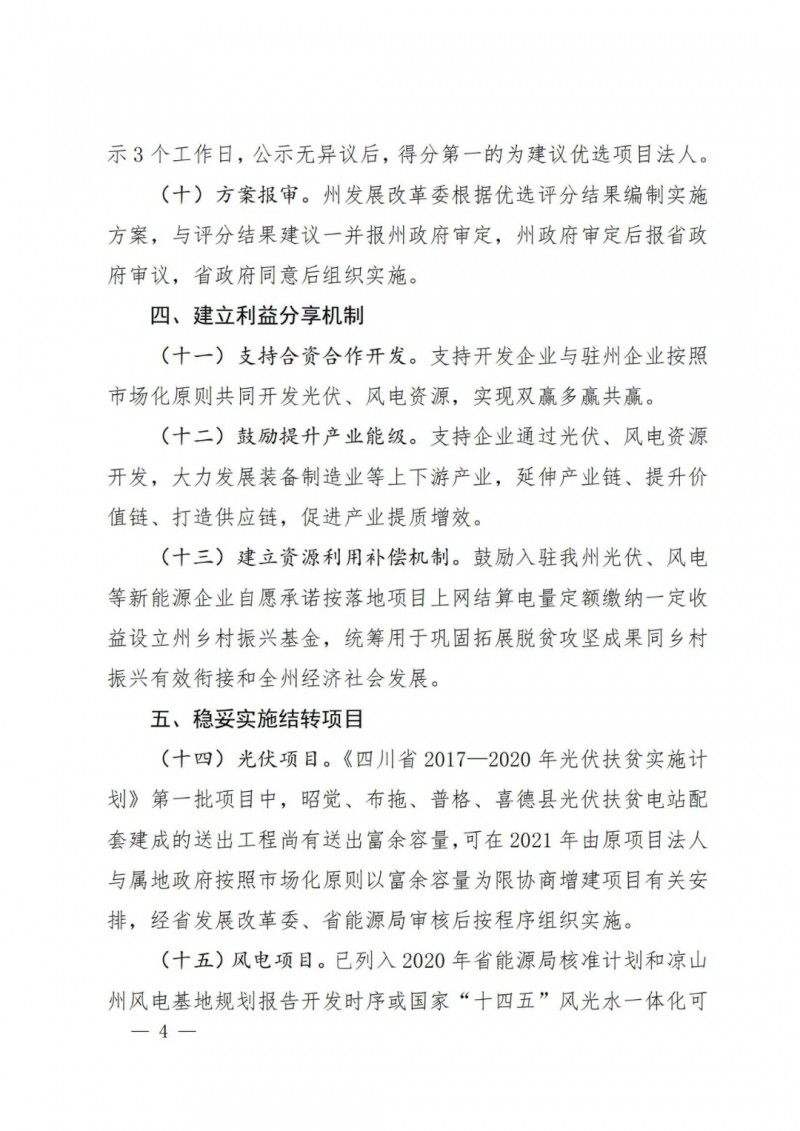 光伏項目?!端拇ㄊ?017—2020 年光伏扶貧實施計 劃》第一批項目中,昭覺、布拖、普格、喜德縣光伏扶貧電站配 套建成的送出工程尚有送出富余容量,可在2021 年由原項目法人 與屬地政府按照市場化原則以富余容量為限協(xié)商增建項目有關(guān)安 排,經(jīng)省發(fā)展改革委、省能源局審核后按程序組織實施。