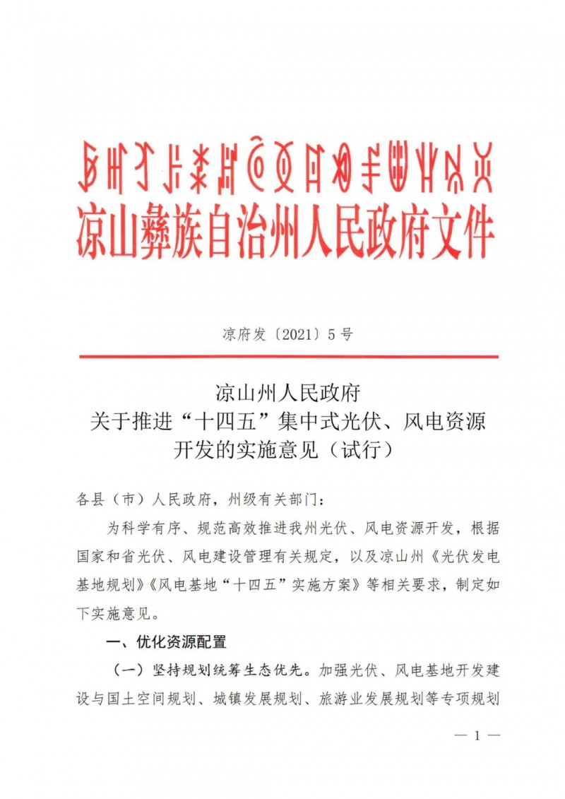 近日,涼山州人民政府發(fā)布《關(guān)于推進(jìn)“十四五”集中式光伏、 風(fēng)電資源開發(fā)的實施意見(試行)》,意見提出: