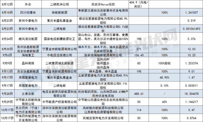 正泰之后,中廣核以658MW電站出售規(guī)模排名賣方市場第四。11月12日,新加坡勝科工業(yè)宣布已通過全資子公司勝科能源投資(上海)有限公司簽署股權購買協(xié)議,將以33億元收購深圳中廣核三期產業(yè)投資基金合伙企業(yè)及其附屬公司一項在營風電和太陽能資產組合98%的權益,涉及電站10個,總裝機658MW。據(jù)了解,此次收購預計將于明年上半年完成。
