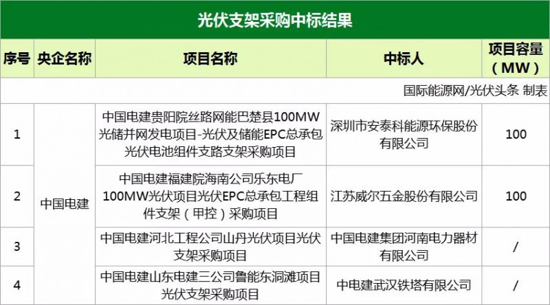 光伏支架采購入圍企業(yè)有深圳市安泰科能源環(huán)保股份有限公司、江蘇威爾五金股份有限公司、中國電建集團(tuán)河南電力器材有限公司、中電建武漢鐵塔有限公司。