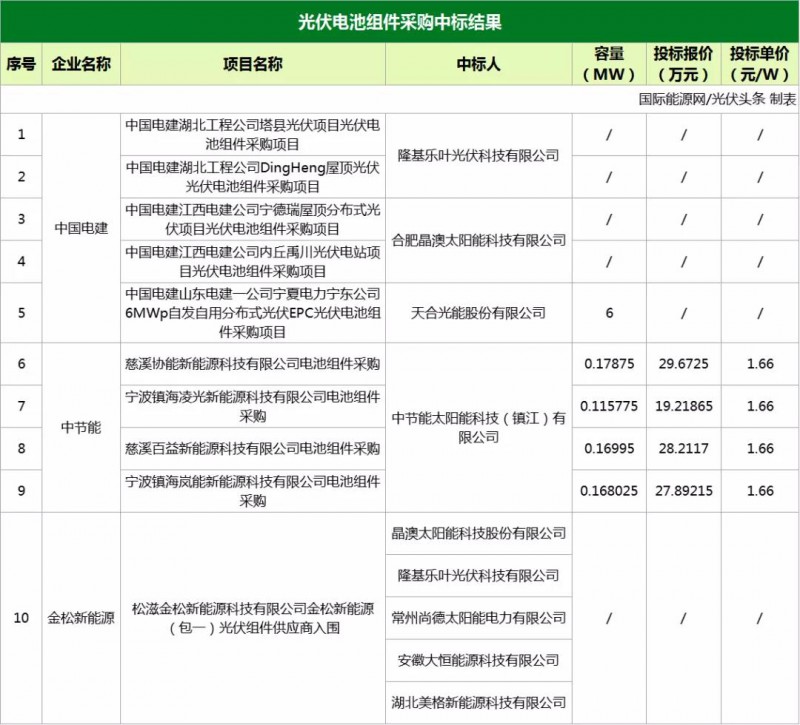 近日,中國電建、中節(jié)能、金松新能源發(fā)布光伏電池組件、光伏逆變器、光伏支架等項(xiàng)目中標(biāo)結(jié)果公告。規(guī)模合計(jì)為212.6325MW。