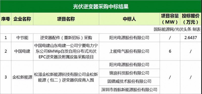 光伏逆變器采購入圍企業(yè)有陽光電源股份有限公司、上能電氣股份有限公司、錦浪科技股份有限公司、固德威技術(shù)股份有限公司、深圳市首航新能源股份有限公司;