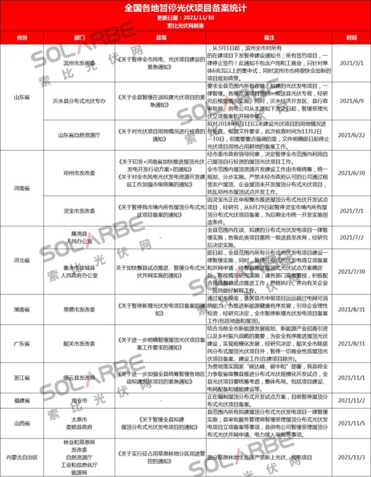 據(jù)索比光伏網(wǎng)統(tǒng)計(jì),截至今年11月末,全國(guó)共有13個(gè)地區(qū)發(fā)布暫停申報(bào)工作的消息,此外,福建省南安市雖未有正式文件,但經(jīng)銷商爆料稱,當(dāng)?shù)匾褵o(wú)法進(jìn)行分布式光伏備案并網(wǎng)。