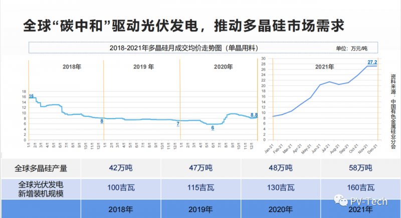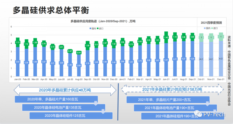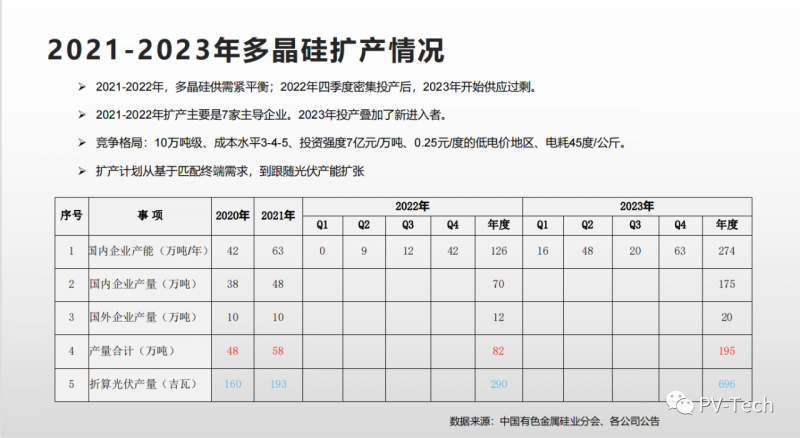 呂錦標(biāo)在報(bào)告里也公布了全球7家主要企業(yè)和4家新進(jìn)入企業(yè)的擴(kuò)產(chǎn)情況,預(yù)測2022年多晶硅供應(yīng)可以超過80萬噸,比今年增加20萬噸。主要產(chǎn)能集中在下半年投產(chǎn)。對應(yīng)明年200吉瓦的裝機(jī)預(yù)測,多晶硅供應(yīng)大于需求。有望推動(dòng)價(jià)格下行。