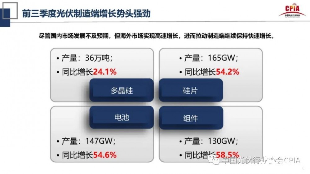 在此次會(huì)議上,王勃華對(duì)光伏行業(yè)的發(fā)展情況做了詳細(xì)介紹。在光伏制造端方面,他指出,2021年前三季度光伏制造端增長(zhǎng)勢(shì)頭強(qiáng)勁,在光伏制造端四個(gè)環(huán)節(jié)中,多晶硅產(chǎn)量為36萬噸,同比增長(zhǎng)24.1%;硅片產(chǎn)量為165GW,同比增長(zhǎng)54.2%;電池產(chǎn)量為147GW,同比增長(zhǎng)54.6%;組件產(chǎn)量為130GW,同比增長(zhǎng)58.5%。他表示,盡管國(guó)內(nèi)市場(chǎng)發(fā)展不及預(yù)期,但海外市場(chǎng)實(shí)現(xiàn)了高速增長(zhǎng),進(jìn)而拉動(dòng)光伏制造端繼續(xù)保持快速增長(zhǎng)。因此,光伏制造端在今年仍處于快速發(fā)展中。