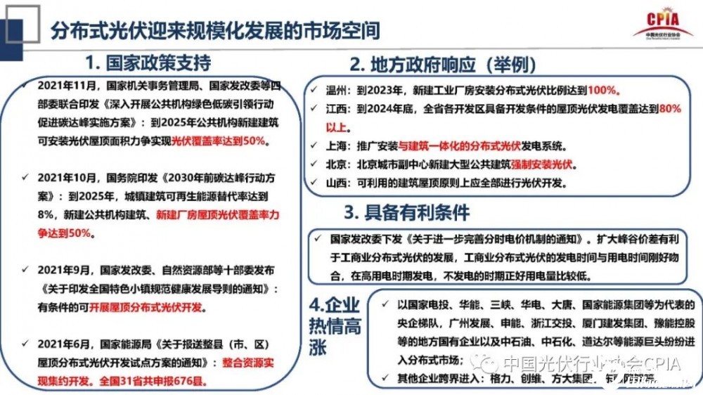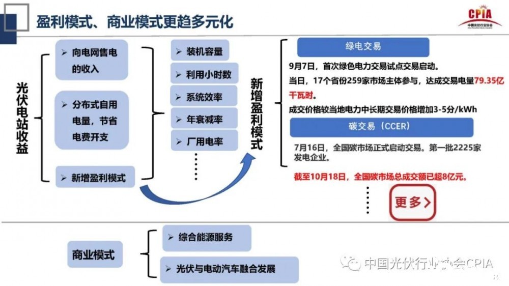 王勃華還指出,未來分布式光伏將迎來規(guī)?;l(fā)展的市場(chǎng)空間。究其原因是,第一,國(guó)家、地方政策的支持,以央企為梯隊(duì),地方國(guó)有企業(yè)和跨界能源巨頭企業(yè)為代表紛紛進(jìn)入分布式市場(chǎng)。第二,光伏盈利模式、商業(yè)模式的多元化。盈利上光伏電站收益新增綠電交易和碳交易(CCER)等盈利模式,商業(yè)模式方面是綜合能源服務(wù)和光伏與電動(dòng)汽車融合發(fā)展。