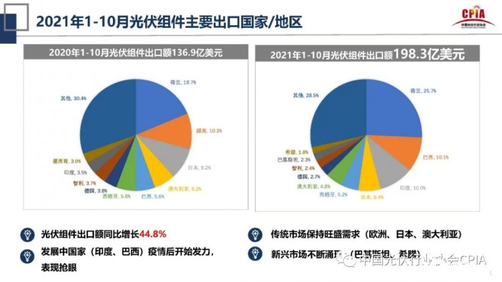 緊接著,王勃華對(duì)2020年和2021年光伏組件主要出口國(guó)家/地區(qū)做了介紹。2021年1-10月光伏組件出口額為198.3億美元,其中,歐洲、日本、澳大利亞等傳統(tǒng)市場(chǎng)國(guó)家保持旺盛需求,巴基斯坦、希臘等新興市場(chǎng)也不斷涌現(xiàn)出來。對(duì)比2020年,2020年1-10月光伏組件出口額為136.9億美元,同比增長(zhǎng)44.8%,其中,印度、巴西等發(fā)展中國(guó)家在疫情后開始發(fā)力,表現(xiàn)十分搶眼。
