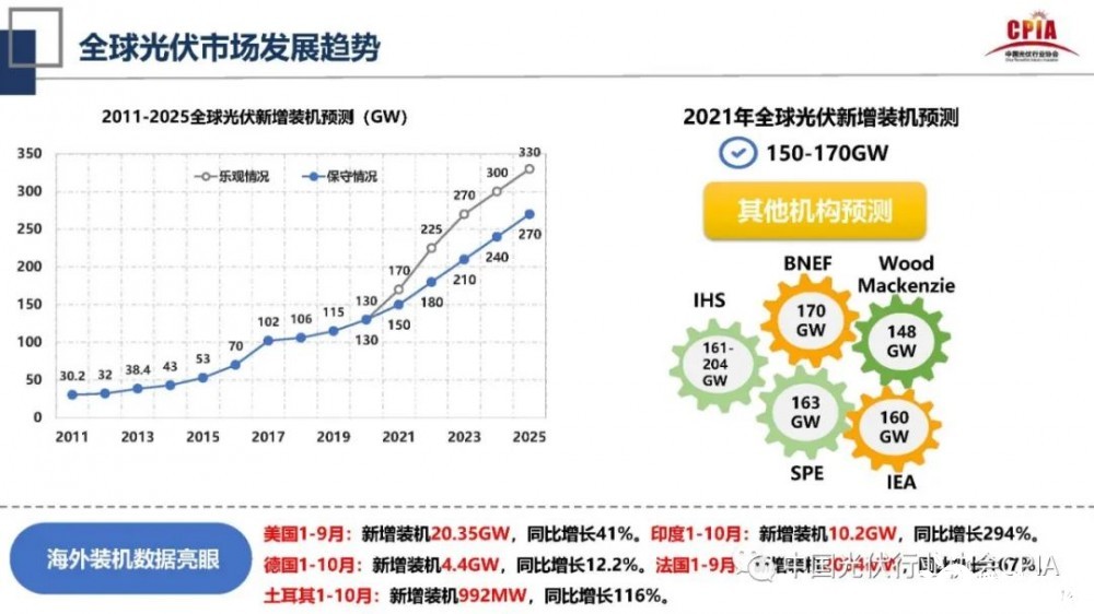 根據(jù)國(guó)際著名的研究機(jī)構(gòu)預(yù)測(cè),到2050年可再生能源發(fā)電量占比提升到90%,其中光伏和風(fēng)電占比63%,全球光伏裝機(jī)將超過14000GW。而在比較樂觀的情形下,2021-2026年光伏新增裝機(jī)將從160GW增到260GW,6年間光伏累計(jì)新增裝機(jī)量占可再生能源累計(jì)新增裝機(jī)量的60%。2021年全球光伏新增裝機(jī)預(yù)測(cè)達(dá)150-170GW。