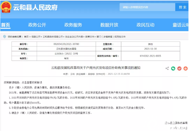 《通知》指出,2021年,省能源局下達(dá)云和縣可再生能源專項(xiàng)資金80萬(wàn)元,經(jīng)研究,決定將該筆資金用于支持戶用光伏發(fā)電項(xiàng)目的發(fā)展。