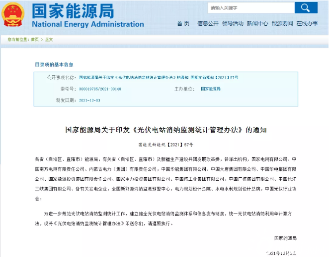 12月20日,國家能源局發(fā)布關于印發(fā)《光伏電站消納監(jiān)測統(tǒng)計管理辦法》的通知。