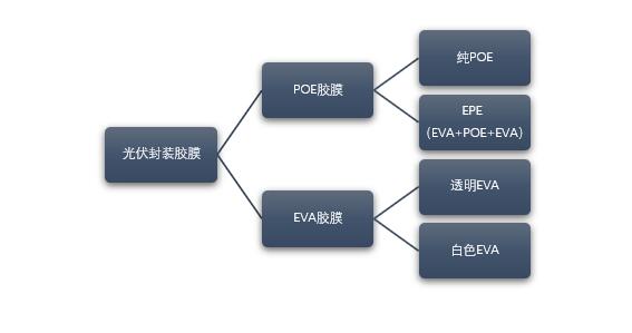 當(dāng)前光伏膠膜市場(chǎng)主流產(chǎn)品為EVA膠膜和POE膠膜兩種,其中EVA膠膜又分成透明EVA膠膜和白色EVA膠膜,POE膠膜則包含純POE膠膜和共擠POE膠膜(即EPE膠膜)。