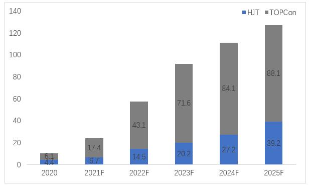 與P型電池相比,N型電池?fù)碛修D(zhuǎn)換效率高、溫度系數(shù)低、光衰減系數(shù)低、弱光響應(yīng)等綜合優(yōu)勢(shì),不僅BOS成本更低,N型電池在全生命周期內(nèi)的發(fā)電量也高于P型。根據(jù)各主流廠商擴(kuò)產(chǎn)計(jì)劃,2022年N型電池?cái)U(kuò)產(chǎn)規(guī)劃或達(dá)到40-50GW,實(shí)現(xiàn)規(guī)模化量產(chǎn)。