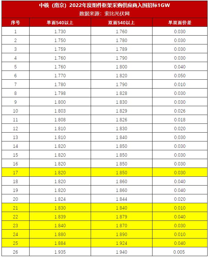 1月19日,中核(南京)2022年度1GW光伏組件框架采購供應(yīng)商入圍招標(biāo)正式開標(biāo)。索比光伏網(wǎng)獲悉,本次共26家企業(yè)提供報(bào)價(jià),單面組件最低報(bào)價(jià)1.73元/W,最高報(bào)價(jià)1.935元/W,平均1.811元/W。雙面組件最低報(bào)價(jià)1.76元/W,最高報(bào)價(jià)1.94元/W,平均1.839元/W。多數(shù)企業(yè)單、雙面價(jià)差在0.03元/W左右。