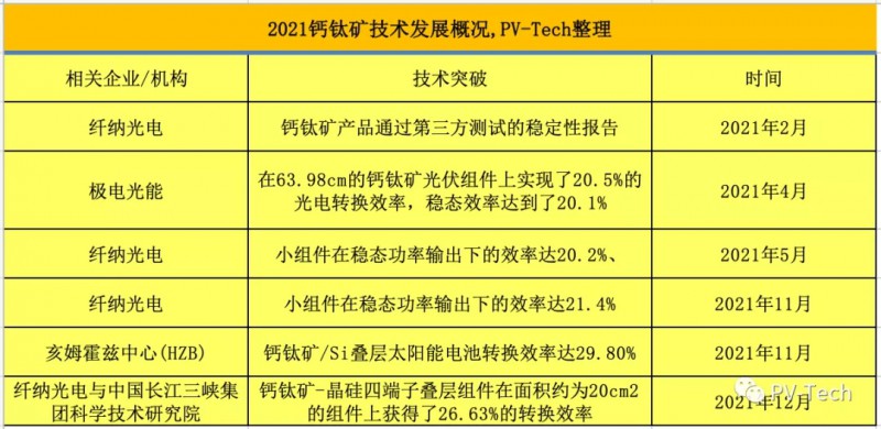 2021年各企業(yè)及研究機構鈣鈦礦技術突破匯總,PV-Tech整理
