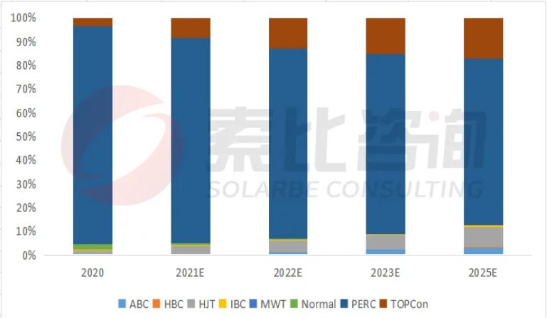 當(dāng)前,PERC電池仍為主流市場,2021年P(guān)ERC市占率85%以上,隨著PERC效率已至頂點(diǎn),N型技術(shù)逐步發(fā)展,目前PERC產(chǎn)能預(yù)留改造TOPCON產(chǎn)線,未來擴(kuò)產(chǎn)產(chǎn)能以N型技術(shù)為主,N型技術(shù)市占率逐步提升。
