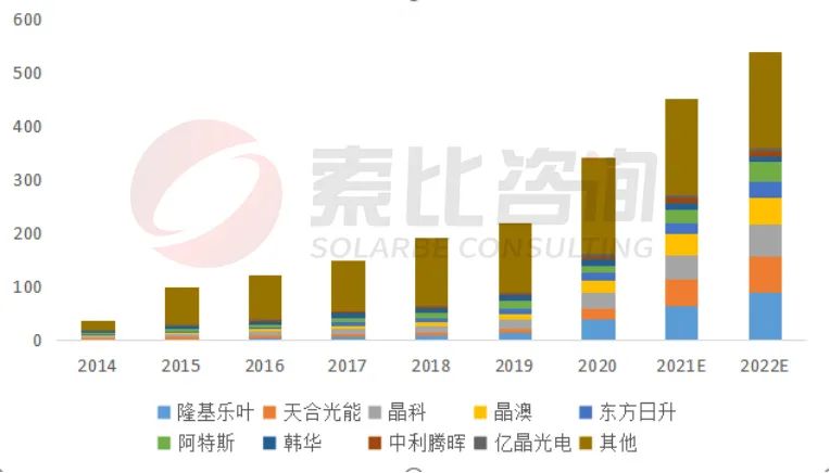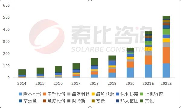 2021年底全球硅片產(chǎn)能366GW,索比咨詢預(yù)計(jì)2022年底硅片產(chǎn)能將達(dá)515GW,硅片產(chǎn)能供過于求。伴隨高景太陽能、雙良節(jié)能等新玩家重資入場,新老玩家競爭將加劇中小企業(yè)淘汰,雙寡頭局面或更改。