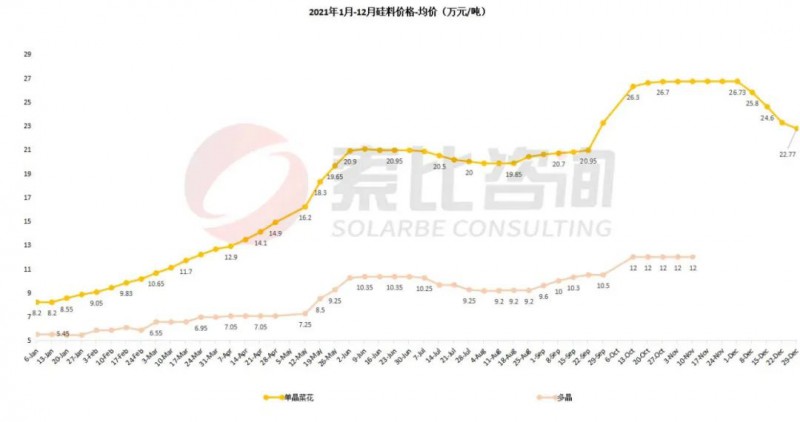 2021年,硅片價格在與上下游的博弈間進(jìn)行階段性調(diào)價,其中4月份至6月份漲幅最大,并推升硅片價格至上半年的高峰,11月-12月硅片價格為減輕庫存、沖擊年度營業(yè)額,價格出現(xiàn)下跌。