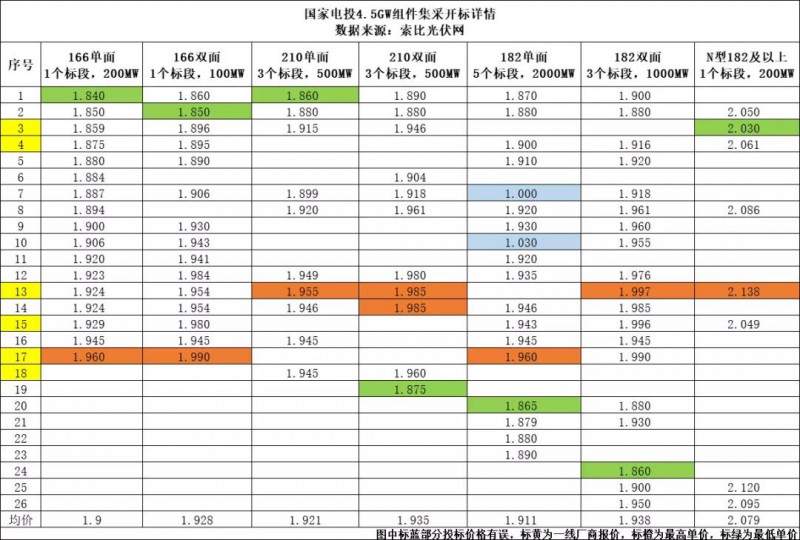 其中166單玻450Wp及以上采購容量200MW,共有17家組件廠商參與投標,投標價在1.84~1.96元/W,均價1.9元/W。