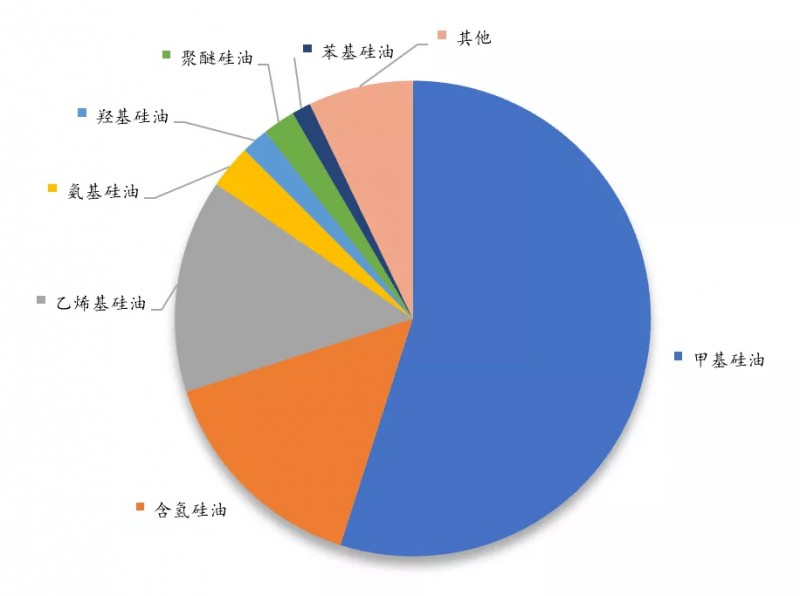 國內(nèi)本土企業(yè)的產(chǎn)品多集中在中低端,如常規(guī)甲基硅油,含氫硅油等,該類產(chǎn)品近幾年呈現(xiàn)與單體廠緊密共生的特征,份額逐步向上游企業(yè)集中。由于過去幾年硅橡膠等下游產(chǎn)品發(fā)展較快,乙烯基硅油等產(chǎn)品的發(fā)展速度也與之相匹配。其他種類硅油如聚醚硅油、氨基硅油、嵌段硅油等特種硅油的產(chǎn)量份額較低,但消費增速近幾年有加速態(tài)勢。部分以技術(shù)見長的中小企業(yè)為規(guī)避常規(guī)硅油產(chǎn)品的激烈競爭,轉(zhuǎn)向發(fā)展特種硅油。各種類型的硅油市場份額如圖1所示。
