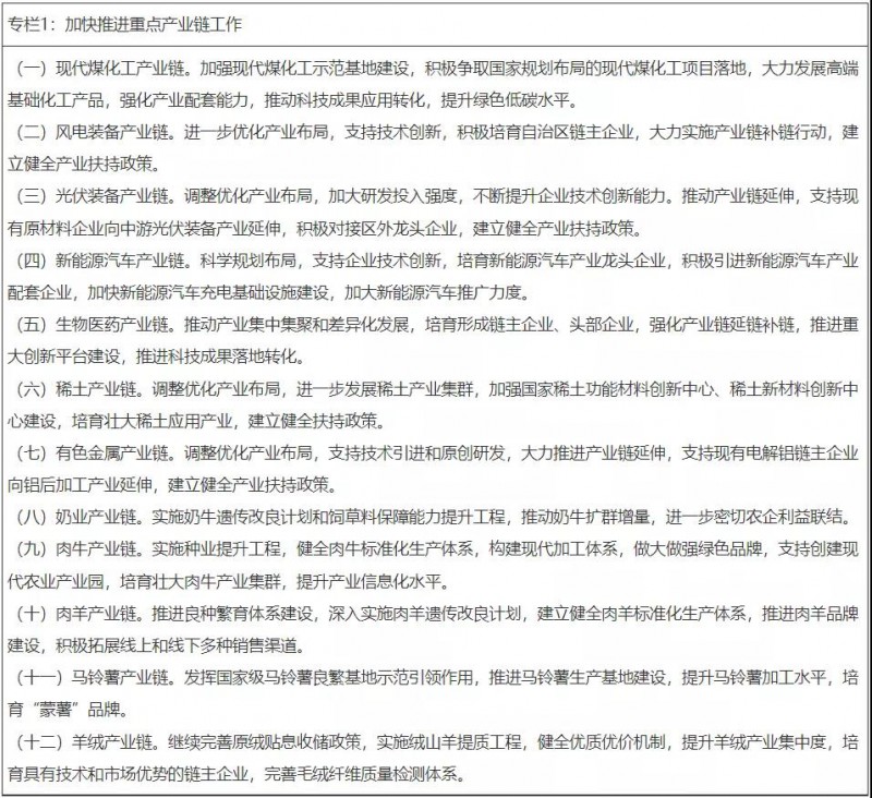 2月9日,內(nèi)蒙古自治區(qū)人民政府發(fā)布了《關(guān)于下達(dá)2022年內(nèi)蒙古自治區(qū)國(guó)民經(jīng)濟(jì)和社會(huì)發(fā)展計(jì)劃的通知》。通知提出,加快推進(jìn)光伏裝備產(chǎn)業(yè)鏈等重點(diǎn)產(chǎn)業(yè)鏈工作,包括調(diào)整優(yōu)化產(chǎn)業(yè)布局,加大研發(fā)投入強(qiáng)度,不斷提升企業(yè)技術(shù)創(chuàng)新能力;推動(dòng)產(chǎn)業(yè)鏈延伸,支持現(xiàn)有原材料企業(yè)向中游光伏裝備產(chǎn)業(yè)延伸,積極對(duì)接區(qū)外龍頭企業(yè),建立健全產(chǎn)業(yè)扶持政策。