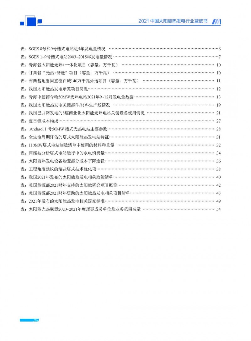 2021中國太陽能熱發(fā)電行業(yè)藍(lán)皮書(以下簡稱“藍(lán)皮書”)共分為9個章節(jié),分別為:太陽能熱發(fā)電的發(fā)展機(jī)遇和定位、太陽能熱發(fā)電市場發(fā)展、我國太陽能熱發(fā)電示范項(xiàng)目運(yùn)行情況、我國太陽能熱發(fā)電產(chǎn)業(yè)鏈情況、我國太陽能熱發(fā)電研發(fā)項(xiàng)目情況、太陽能熱發(fā)電投資成本、太陽能熱發(fā)電站全生命周期碳排放、太陽能熱發(fā)電發(fā)展面臨的挑戰(zhàn)及對策,以及附錄。附錄主要包括:我國2021年發(fā)布的太陽能熱發(fā)電項(xiàng)目政策、美國能源部2021年度支持的太陽能熱發(fā)電項(xiàng)目清單、2021年發(fā)布的太陽能熱發(fā)電相關(guān)國家標(biāo)準(zhǔn)、我國太陽能熱發(fā)電行業(yè)發(fā)展主要?dú)v程、太陽能光熱聯(lián)盟理事成員單位及業(yè)務(wù)范圍名錄。全文4.5萬+字,共55張圖表。