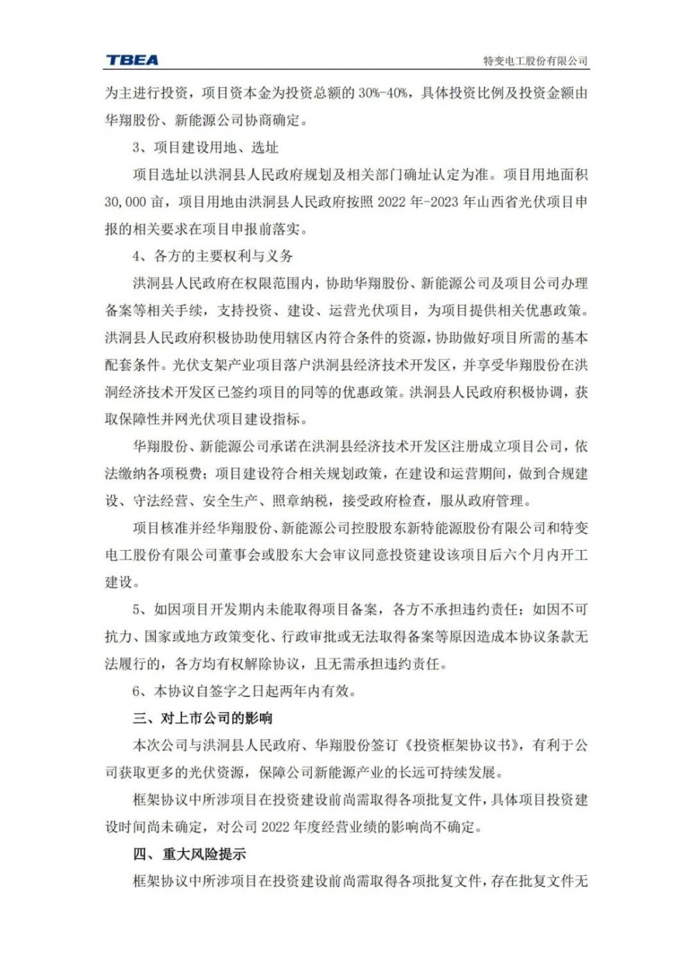 特變電工新疆新能源股份有限公司與洪洞縣人民政府、華翔股份在山西省臨汾市洪洞縣簽署了《1GW 光伏發(fā)電及配套項目投資框架協(xié)議書》。