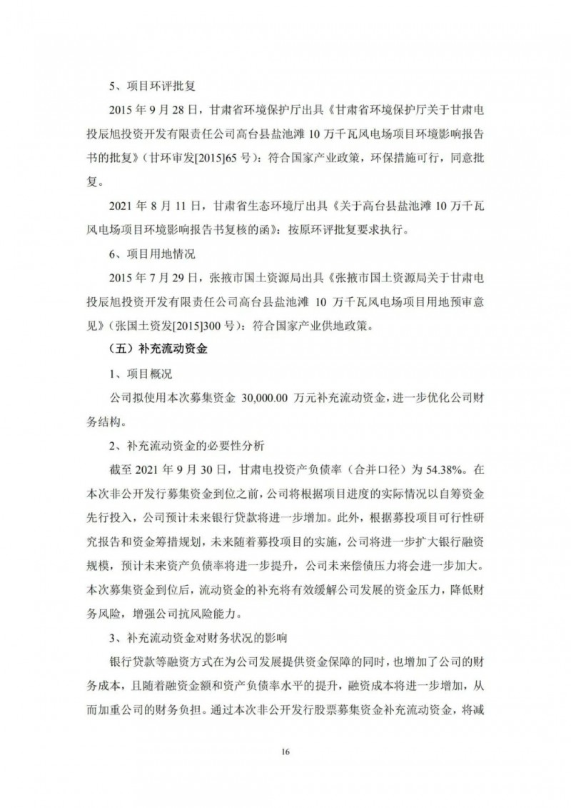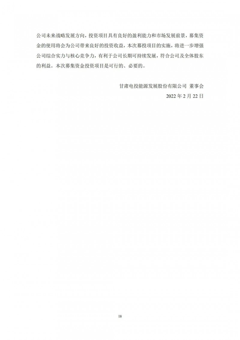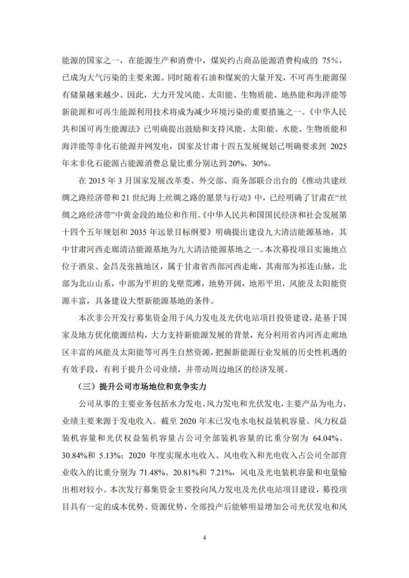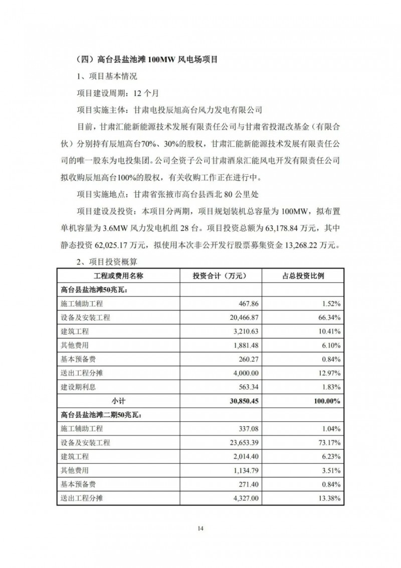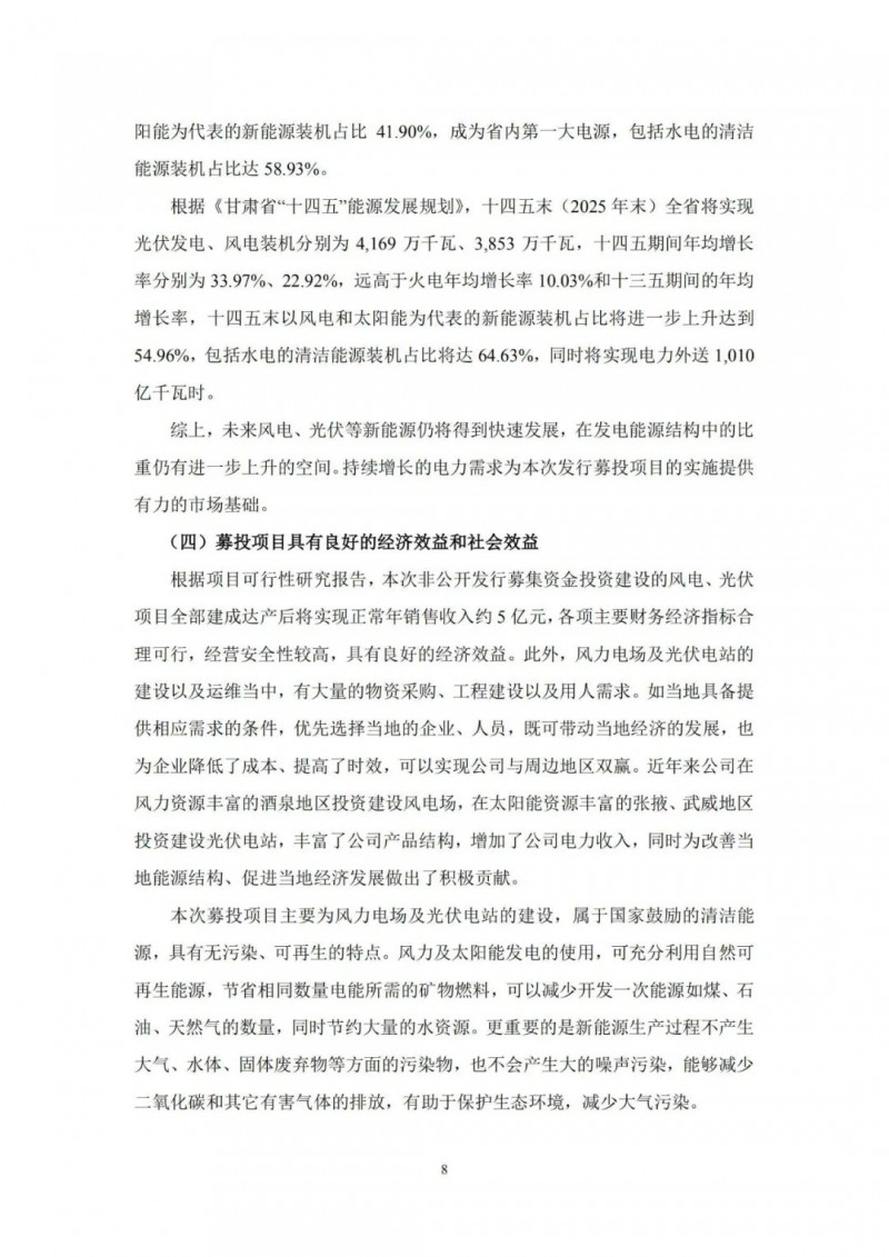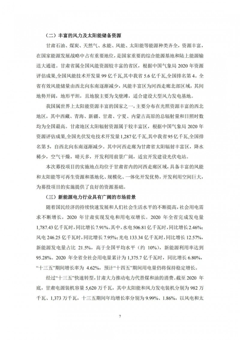 2月21日,甘肅電投發(fā)布公告,擬定增募資不超過12億元,用于玉門市麻黃灘第一風(fēng)電場C區(qū)200兆瓦項目、瓜州干河口200MW光伏項目、永昌河清灘300MW光伏發(fā)電項目、高臺縣鹽池灘100MW風(fēng)電場項目及補(bǔ)充流動資金。天眼查app顯示,公司是于1997年7月8日經(jīng)甘肅省人民政府甘政函[1997]36號文件批準(zhǔn),由西北油漆廠獨家發(fā)起,部分改制,采用募集設(shè)立方式設(shè)立的股份有限公司。公司1997年8月29日向社會公眾公開發(fā)行4500萬股人民幣普通股,并于1997年9月23在甘肅省工商行政管理局登記注冊。1997年10月14日經(jīng)中國證券監(jiān)督管理委員會批準(zhǔn),公司股票在深圳證券交易所上市交易。自2012年12月21日起,公司名稱由"西北永新化工股份有限公司"變更為"甘肅電投能源發(fā)展股份有限公司"。