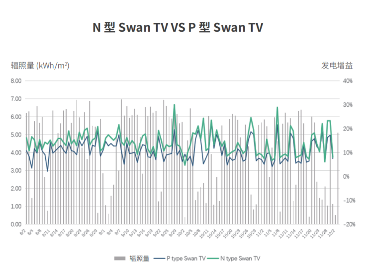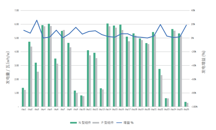 技術人員指出,N型TOPCon已經(jīng)在量產(chǎn)效率、成本控制和市場份額上取得明顯優(yōu)勢,高效N型產(chǎn)品將加速新能源大基地項目高質量落地。長遠來看,TOPCon電池正處于高速發(fā)展期,其效率的不斷提升會不斷拉大N、P型組件的功率差異,制造工藝的優(yōu)化、新型技術的應用亦會不斷擴大其在成本端的優(yōu)勢。“在山東、浙江、海南的實證數(shù)據(jù)表明,同尺寸N型雙面組件在不同環(huán)境、不同時段、不同天氣下都能帶來更高發(fā)電量,平均比P型雙面組件高2.95%-10.26%。得益于更低的溫度系數(shù),隨著太陽輻照度的增加,N型組件的輸出功率呈線性增加。此外,在低輻照度下,得益于更好的弱光性表現(xiàn),N型組件能提供更高輸出功率以及更好的標準化輸出功率。”