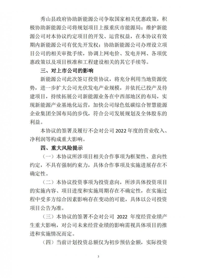此次簽訂投資協(xié)議,新能源公司將充分利用當(dāng)?shù)刭Y源優(yōu)勢,進(jìn)一步擴(kuò)大公司光伏發(fā)電產(chǎn)業(yè)規(guī)模,并依托已投產(chǎn)及待建項目,持續(xù)拓展公司新能源業(yè)務(wù)在中西部地區(qū)的布局,實(shí)現(xiàn)新能源產(chǎn)業(yè)基地化運(yùn)營,加快公司綠色低碳綜合智慧能源企業(yè)集團(tuán)全國布局的步伐。