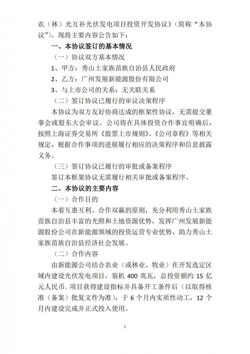 2月26日,廣州發(fā)展發(fā)布公告稱,其全資子公司廣州發(fā)展新能源股份有限公司與與重慶市秀山土家族苗族自治縣人民政府簽署《秀山土家族苗族自治縣400MW農(nóng)(林)光互補(bǔ)光伏發(fā)電項目投資開發(fā)協(xié)議》。