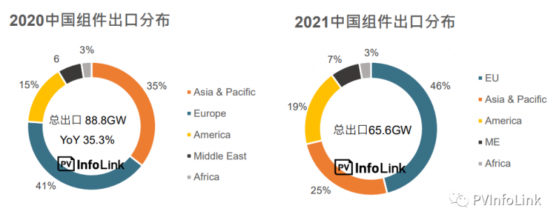 2021光伏產(chǎn)業(yè)面臨動蕩的一年,歷經(jīng)了多晶硅暴漲,以及中國的能耗管控政策,供應鏈價格劇烈波動,但全球光伏裝機仍是繳出了優(yōu)異的成績。根據(jù)PV Infolink統(tǒng)計,2021年的全球光伏新增裝機容量達到172.6 GW,同比成長23.1%,其中,非中國市場的裝機量來到了124.6GW,同比成長了30.1%。海外需求的快速成長也帶動了中國光伏組件的出口,根據(jù)PV Infolink統(tǒng)計中國海關出口資料,中國在2021出口組件總量來到了88.8GW,同比增長了35.3%。主要的成長來源仍是歐洲、巴西和印度等主要光伏市場。