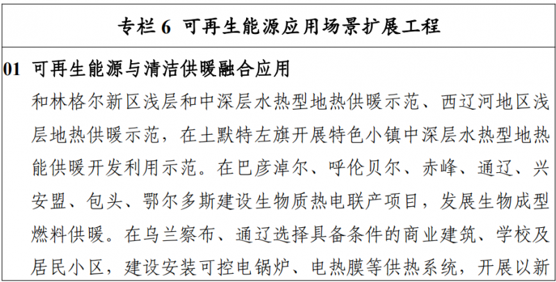 四、廣泛擴(kuò)展可再生能源應(yīng)用場景實(shí)施火電靈活性改造。加快存量煤電改造升級,推廣深度調(diào)峰技術(shù)應(yīng)用,積極推進(jìn)現(xiàn)役煤電機(jī)組實(shí)施靈活性改造, 鼓勵新建煤電機(jī)組靈活性制造,降低新建煤電機(jī)組最小技術(shù)出力水平,提升電力系統(tǒng)整體消納能力,促進(jìn)新能源大規(guī)模開發(fā)和高效利用,引導(dǎo)煤電由主力電源逐步向“支撐型”、“調(diào) 節(jié)型”電源轉(zhuǎn)變。推進(jìn)工業(yè)園區(qū)可再生替代。充分挖掘燃煤自備電廠園區(qū)的電源靈活調(diào)節(jié)能力和負(fù)荷側(cè)需求響應(yīng)能力,推動園區(qū)自備電廠參與調(diào)峰,改變單一依靠自備火電的傳統(tǒng)供能方式,因地制宜推動風(fēng)電、光伏建設(shè),鼓勵集中式與分布式并舉,在 不占用公共電網(wǎng)的消納空間且保證用能安全的前提下實(shí)現(xiàn) 新能源全額自發(fā)自用,逐步實(shí)現(xiàn)園區(qū)用能清潔化。開展低碳工業(yè)園區(qū)示范。鼓勵具備新增負(fù)荷的園區(qū)開展低碳工業(yè)園示范項(xiàng)目,以近零碳用能為目標(biāo),率先開展全清潔能源供電,提升園區(qū)整體能效。通過自建分布式、新能源專線供電、綠色電力交易、綠證交易等多種方式,實(shí)現(xiàn)園區(qū)新增用電需求主要由新能源滿足。同時,鼓勵園區(qū)通過配置儲能等措施,保證與園區(qū)負(fù)荷的匹配響應(yīng)和高比例自平衡, 不占用公共電網(wǎng)消納空間。推廣“綠電+綠氫”發(fā)展新模式。鼓勵采用具有適應(yīng)可再生能源出力波動的綠色制氫技術(shù),加快推進(jìn)風(fēng)光氫儲一體化示范,推廣氫燃料電池汽車在礦山、物流、公交等領(lǐng)域的規(guī)模化應(yīng)用,積極探索氫能在冶金、化工、交通等領(lǐng)域的應(yīng)用。開展源網(wǎng)荷儲一體化示范。充分挖掘和釋放生產(chǎn)側(cè)、消費(fèi)側(cè)調(diào)節(jié)能力,最大化發(fā)揮負(fù)荷側(cè)調(diào)節(jié)響應(yīng)能力,就近合理配套新能源,加強(qiáng)源網(wǎng)荷儲多向互動,通過電價優(yōu)勢帶動儲能、大數(shù)據(jù)、新能源、新材料等行業(yè)全產(chǎn)業(yè)鏈發(fā)展。加快烏蘭察布、通遼源網(wǎng)荷儲一體化示范工程建設(shè),提升本地電源支撐,有效緩解供電缺口,推動局部新能源就近消納,不占用公共電網(wǎng)調(diào)峰和消納空間,提升新能源開發(fā)利用水平。持續(xù)推廣可再生能源清潔供暖。發(fā)揮自治區(qū)風(fēng)能、光伏、農(nóng)林、地?zé)豳Y源優(yōu)勢,建立多元化可再生能源清潔供暖體系, 促進(jìn)環(huán)境質(zhì)量和人民生活條件改善。在呼包鄂城市群積極推動中深層地?zé)崮芤?guī)?;┡痉叮瑒?chuàng)新城市用能新模式。在蒙東地區(qū)發(fā)展生物質(zhì)熱電聯(lián)產(chǎn)項(xiàng)目,探索以農(nóng)林生物質(zhì)、生物質(zhì)成型燃料等為燃料的生物質(zhì)鍋爐供熱方式,有效保護(hù)城鄉(xiāng)環(huán)境。在呼和浩特、包頭、烏蘭察布、通遼等地,開展清潔電供暖示范。大力發(fā)展以新能源為主的綜合能源應(yīng)用。結(jié)合配電網(wǎng)、燃?xì)饩W(wǎng)、熱力網(wǎng)等能源網(wǎng)絡(luò),綜合可再生能源、儲能、信息通訊等先進(jìn)技術(shù),推動分布式可再生能源高效靈活接入與生產(chǎn)消費(fèi)一體化,建設(shè)冷熱水電氣供應(yīng)的區(qū)域綜合能源系統(tǒng)。