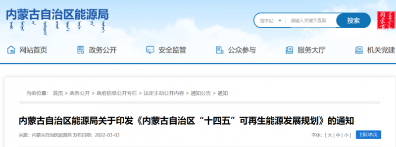 2022年3月2日,內(nèi)蒙古自治區(qū)能源局關(guān)于印發(fā)《內(nèi)蒙古自治區(qū)“十四五”可再生能源發(fā)展規(guī)劃》,提出:"十四五"末,內(nèi)蒙古可再生能源發(fā)電裝機(jī)達(dá)到 1.35 億千瓦以上,其中風(fēng)電 8900 萬千瓦、光伏發(fā)電 4500 萬千瓦,相當(dāng)于新增風(fēng)電項(xiàng)目5115萬千瓦,光伏項(xiàng)目3262萬千瓦,共8377萬千瓦,包含本地消納和外送兩類。平均利用率保持在 90%以上。同時,將依據(jù)國土空間規(guī)劃,完善可再生能源空間用途管制規(guī)則,保障可再生能源開發(fā)利用合理的用地空間需求。落實(shí)草原林地征占用分區(qū)管控政策,保障可再生能源項(xiàng)目使用草原林地需求。規(guī)范土地性質(zhì)認(rèn)定,明確林草等不同地類的用地標(biāo)準(zhǔn)。