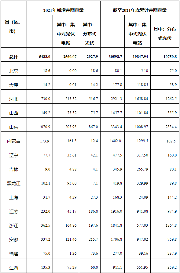 國(guó)家能源局公布2021年光伏發(fā)電建設(shè)運(yùn)行情況,2021年我國(guó)光伏發(fā)電新增并網(wǎng)容量54.88GW,其中集中式光伏電站新增25.6007GW、分布式光伏電站29.279GW。