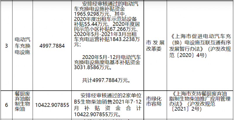 (四)按照《上海市支持餐廚廢棄油脂制生物柴油推廣應(yīng)用管理辦法》(滬發(fā)改規(guī)范〔2021〕2號)規(guī)定,安排經(jīng)審核通過的2家單位B5生物柴油銷售2021年7-12月補貼資金合計10422.907855萬元。