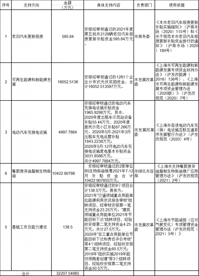 (二)按照《上海市可再生能源和新能源發(fā)展專項資金扶持辦法》(滬發(fā)改能源〔2016〕136號)、《上海市可再生能源和新能源發(fā)展專項資金管理辦法(2020版)》(滬發(fā)改規(guī)范〔2020〕7號)等相關(guān)規(guī)定,安排經(jīng)審核通過的1261個企業(yè)分布式光伏獎勵資金,合計16052.513597萬元。