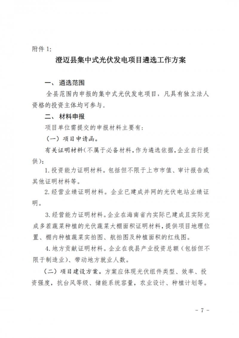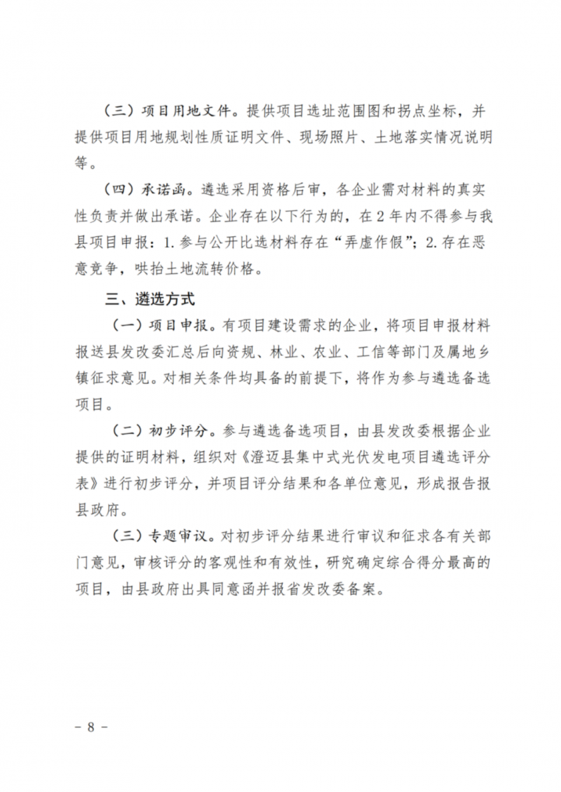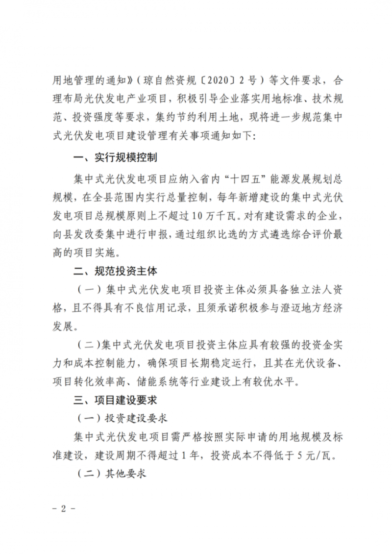 4月11日,澄邁縣發(fā)展和改革委員會、澄邁縣自然資源和規(guī)劃局、澄邁縣農(nóng)業(yè)農(nóng)村局、澄邁縣工業(yè)信息化和科學(xué)技術(shù)局聯(lián)合發(fā)布了《關(guān)于進(jìn)一步規(guī)范集中式光伏發(fā)電項(xiàng)目建設(shè)管理的通知》。本通知自2022年5月12日起施行,有效期2年。